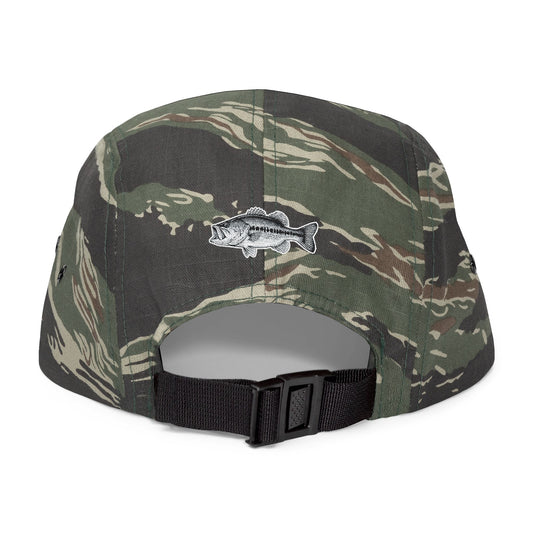 Camo Bass Kings Embroidered 5-Panel Cap — Fishing Hat with Fish Back Logo