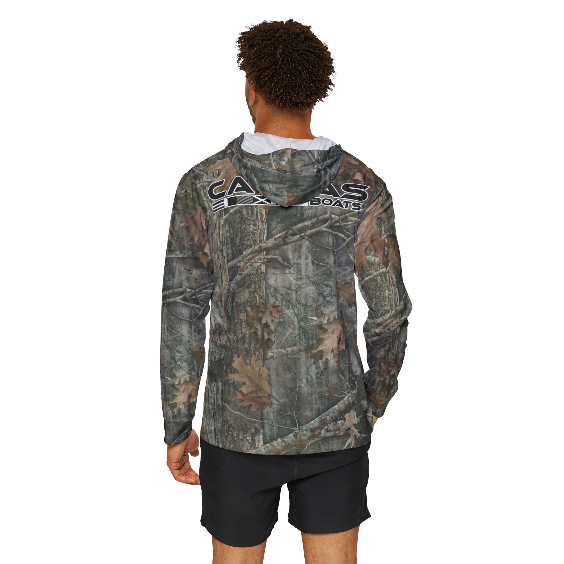A Caymas Camo Boats Fishing Inspired Hoodie made of 100% moisture-wicking polyester, perfect for outdoor activities. This hoodie provides sun protection and keeps you cool with its moisture-wicking material. The design gives a rugged and outdoorsy vibe, suitable for fishing enthusiasts and outdoor adventurers. Perfect for wearing during fishing trips, camping, and outdoor sports.